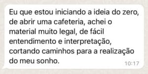 “Li seu e-book e achei um máximo, adorei, amei e descobri várias coisas que eu não sabia. A gente faz projetos, mas várias coisas que eu nunca pensei; esse negócio da região aceitar o CNAE que você precisa ter no seu CNPJ. Fiquei pensando; imagina a pessoa que não faz plano de negócio, não vê isso, não consulta ninguém e ai chega na hora e não pode abrir a cafeteria. Imagina a pessoa que só quer abrir uma cafeteria e não tem noção!? Achei incrível, muito legal. Você está entregando bastante informação. Outra coisa que eu também fiquei pensando sobre o plano de negócios é que hoje em dia está mais difundido; as pessoas pelo menos já ouviram falar sobre. Mas, conheço muita gente que abriu um negócio sem fazer plano de negócio e cometeu um erro grosseiro. Achei muito bom você já começar o e-book falando dele. Em vários momentos você pontua e dá referências. Achei bem completo”.